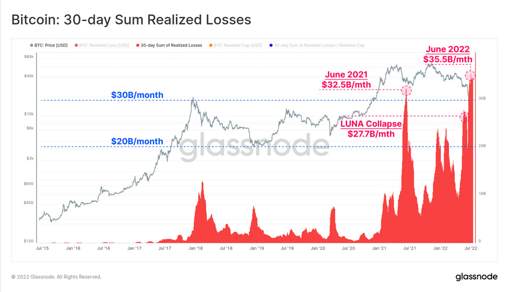 根据Glassnode数据,在5月UST、LUNA崩盘之后,在30天基础上,比特币在5月出现了总计277.7亿美元的已实现亏损;当比特币价格在6月跌破2017年上一波牛市最高点时,6月的已实现亏损更跃升至创纪录的355.5亿美元,这两次已实现亏损都是史无前例。