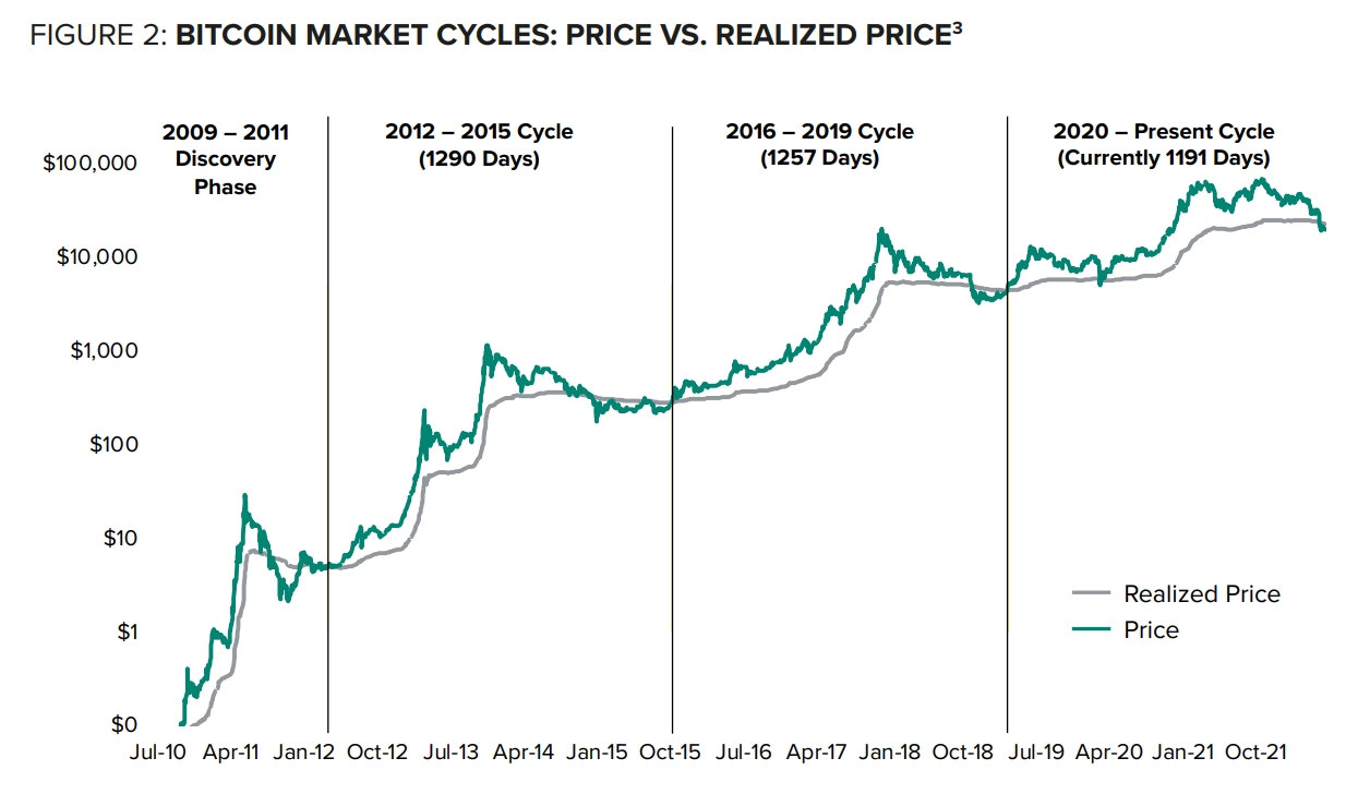 灰度在报告中表示,加密货币市场周期平均持续约4年,或约1,275天,虽然判别加密货币市场周期的方法不尽相同,不过比特币已实现价格(所有购买价值的总和除以当前流通比特币数量)可以用来有效计算加密货币市场周期时间表。