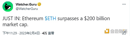 据Watcher.Guru发文表示,以太坊(ETH)市值超过2000亿美元。