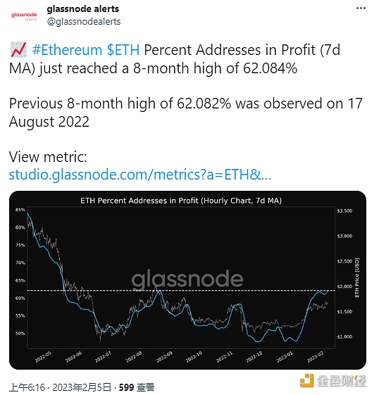 据Glassnode数据显示,以太坊(ETH)盈利地址数量(7日均值)占比达到62.084%,为近8个月以来最高值。