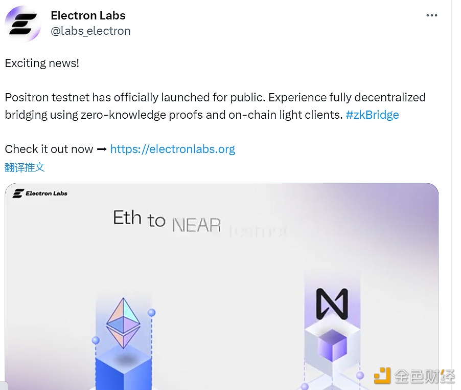 利用零知识轻客户端的跨链协议技术公司Electron Labs宣布正式公开启动Positron测试网,Positron是连接以太坊和NEAR区块链的测试网桥,允许用户在Goerli上存入Electron Demo TGate.ions(EDT)并在NEAR测试网上接收铸造的代币。Electron Labs此前从NEAR收到一笔赠款来利用ZK构建跨链桥,该协议使用链上轻客户端零知识来验证交易的有效性。