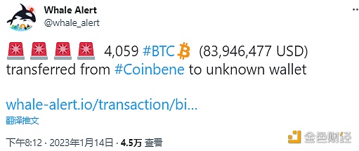 据Whale Alert数据显示,4,059枚BTC (价值约83,946,477 美元)从Coinbene转移到未知钱包。