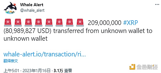 据Whale Alert数据显示,209,000,000 XRP(价值约80,989,827美元)从未知钱包转移到另一未知钱包。