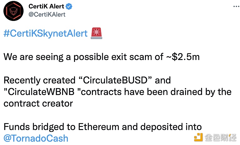 消息,CertiK监测到一个疑似250万美元的退出骗局。最近创建的 "CirculateBUSD "和 "CirculateWBNB "合约已被合约创建者抽空。资金被桥接到以太坊并存入Tornado Cash。