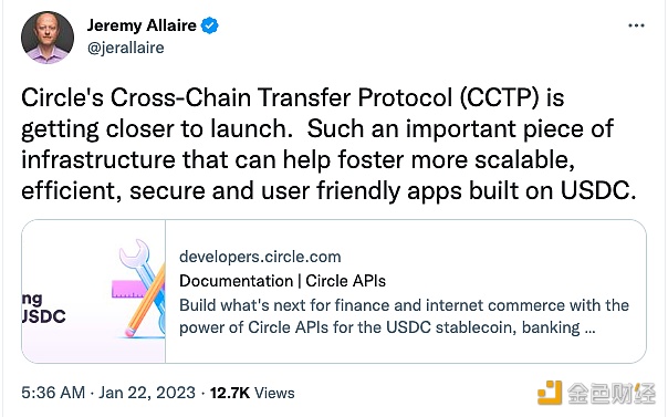 Circle首席执行官Jeremy Allaire在社交媒体上表示,Circle的跨链传输协议 (CCTP) 即将推出。这样一个重要的基础设施,可以帮助培养基于 USDC 构建的更具可扩展性、高效、安全和用户友好的应用程序。