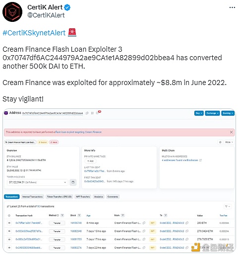 据CertiK监测,Cream Finance闪电贷攻击者0x70747df6AC244979A2ae9CA1e1A82899d02bbea4已将另外50万枚DAI换成ETH。Cream Finance在去年6月遭黑客攻击,损失约880万美元。