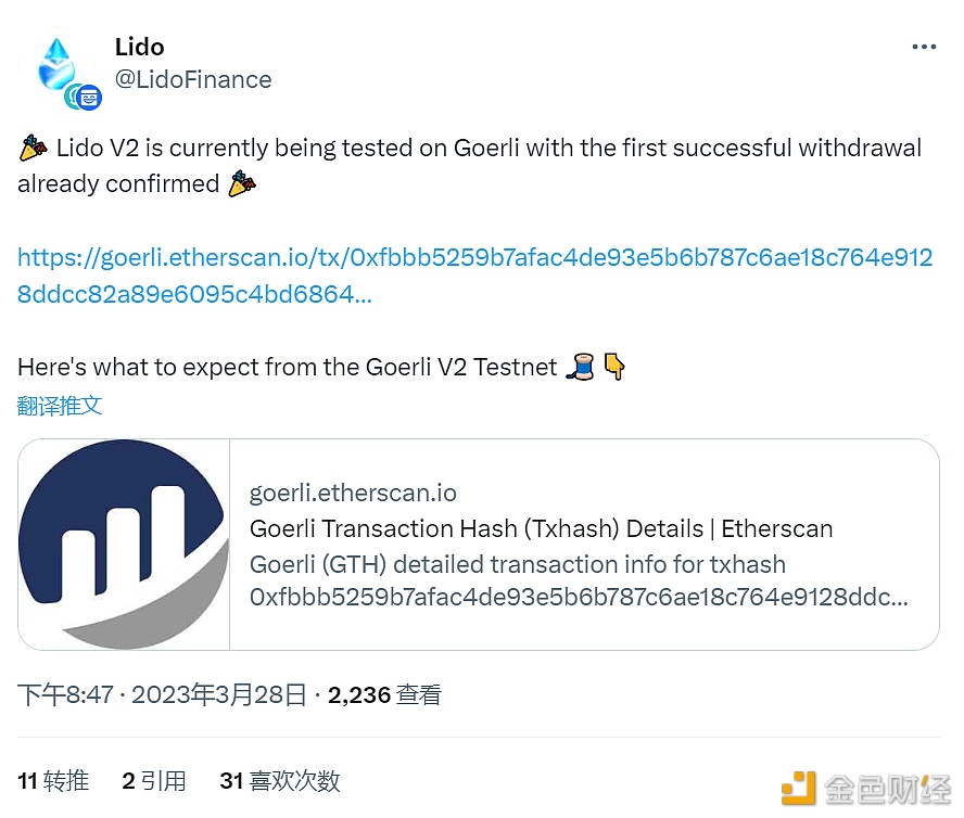 Lido V2目前正在Gorli上测试,已确认首次取款成功
