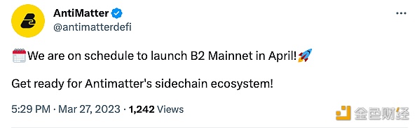 3月27日消息,基于 BNB Chain 的应用侧链 Antimatter B2 宣布计划于 4 月上线主网。 此前报道,跨链永续衍生品协议 Antimatter 去年 6 月宣布推出基于 BNB Chain 的侧链 B2。其基于 BAS 框架构建并兼容 EVM,如质押、RPC-API 和智能合约。Antimatter 的生态系统将迁移至 B2,其中包括 Nonfungible Finance、Structured 和 Quanto 等。
