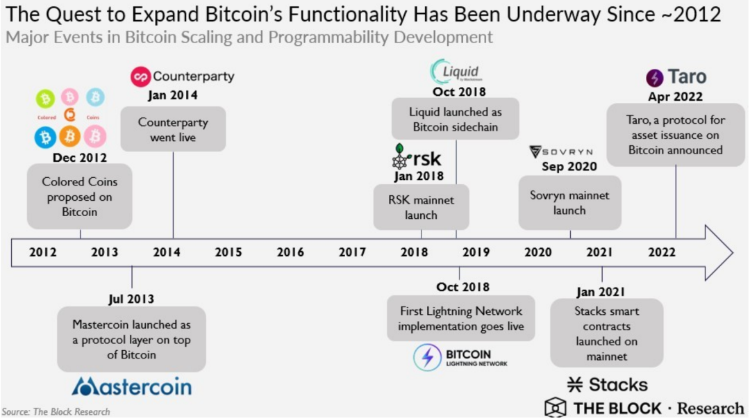 那么,目前比特币生态有哪些底层基础设施的构建呢?我们先来看下面这张图,从2009年比特币主网上线之后,不少底层协议项目开始尝试拓展比特币生态: