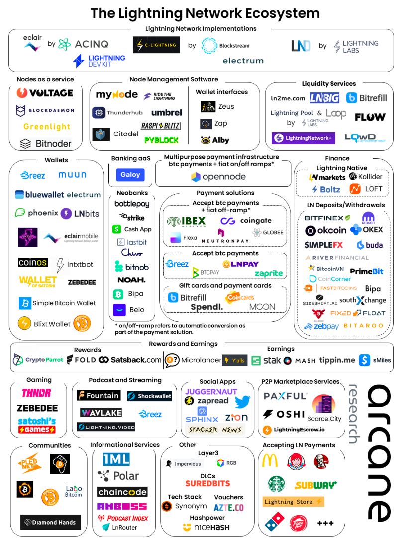目前,闪电网络的生态发展得已经相当丰富,包括闪电网络节点和流动性服务、钱包支付应用、以及游戏、社交网络、零售场景等等。