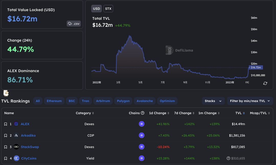 不过Stacks上总的TVL并不大,目前总量不到2000万美元,号称比特币上第一个一站式完整 DeFi 服务平台的Alex贡献将近90%。