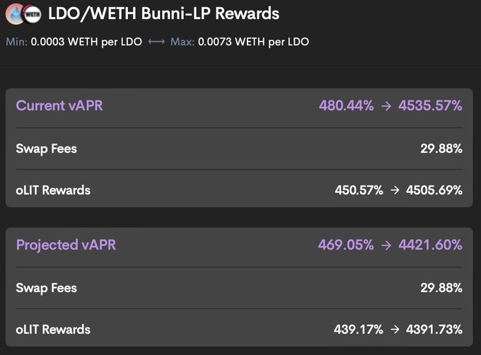 $oLIT是 Bunni的奖励代币,是一种看涨期权代币,可以以低于市场价格的价格购买$LIT。 想要获得$oLIT代币,用户需要锁定$LIT代币并参与平台挖矿和交易。 获得$oLIT代币的唯一方式是在Bunni的gauges投注,这样用户就可以获得相应的$oLIT代币。