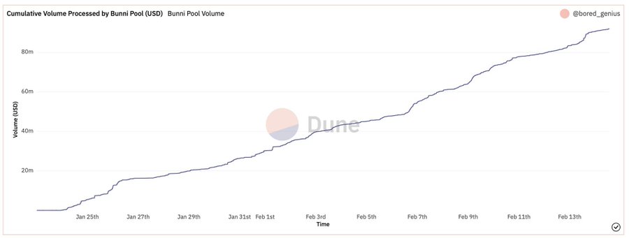 应用场景可以超越Bunni <> Timeless Finance Bunni 作为一个流动性层协议,可以与其他协议形成更多合作关系 代币经济具有不断的买入压力,推高价格 与Timeless Finance的 Flywheel 生态系统类似于Concentrator和Lever 有潜力成为Uniswap的Convex Finance 团队建立了ve88mph,可能构成另一飞轮效应 将新颖的期权想法注入代币设计 类似于opyn的 $SQUEETH 衍生品代币 可能会出现更多这样的衍生代币变体Bunni在持续增长的交易量中展现了自己的实力,这也从侧面证明了团队制定的清晰发展路线图的可行性。 同时,这一点也被由@boredGenius构建的仪表盘所证实。