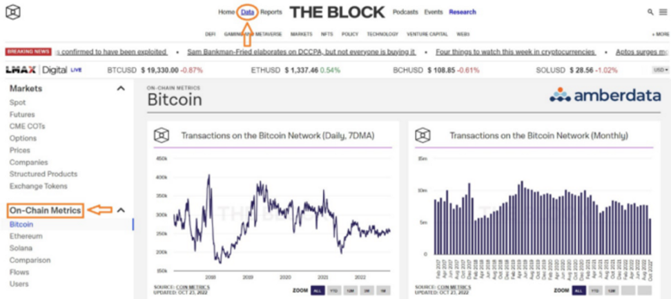 The Block 具有许多有用的指标,例如链上交易量、活跃 / 新地址、矿工收入、平均交易费用和比特币供应量占利润的百分比。