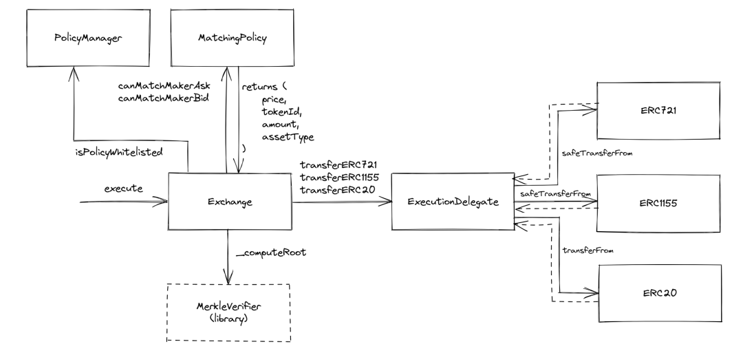 如果匹配成功,再交由Exchange模块执行交易,最后由 ExecutionDelegate 负责转移代币。上述提到的白名单其实是Blur预先设定好的ERC721、ERC1155代币的限价单模式。