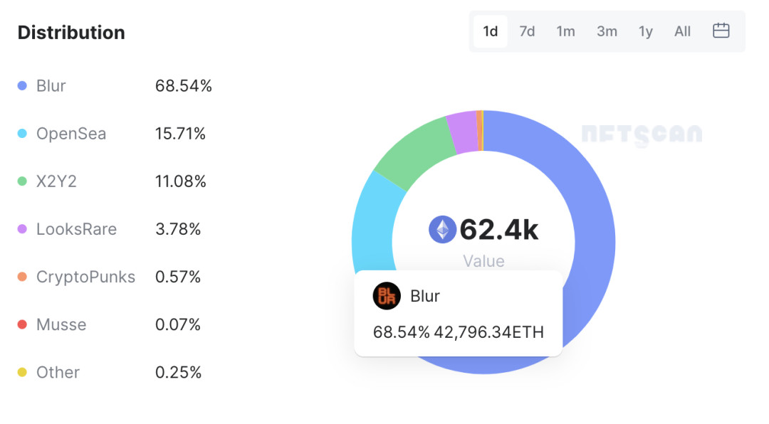可以看到Blur作为NFT交易市场的后起之秀,已经开始从 OpenSea 夺取大量的市场份额。
