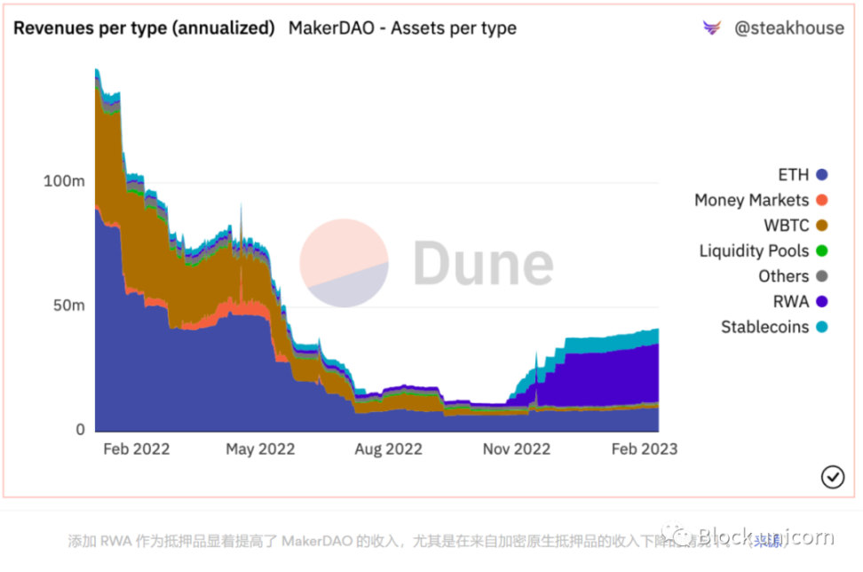 MakerDAO 是一个 DeFi 项目,可以说在 RWA 采用方面取得了最大的进展。目前,该协议有价值 6.8 亿美元以上的 RWA 支持去中心化的稳定币 DAI。通过引入 RWA 作为抵押品,MakerDAO 能够扩大 DAI 在市场上的发行量,加强其挂钩的稳定性,并大幅增加协议收入(22 年 12 月约 70% 的收入来自 RWA)。