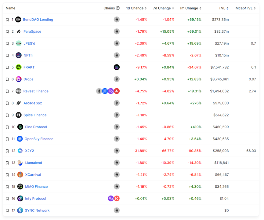 (ParaSpace 的 TVL 跃居 NFT 借贷榜单第二名,defillama)