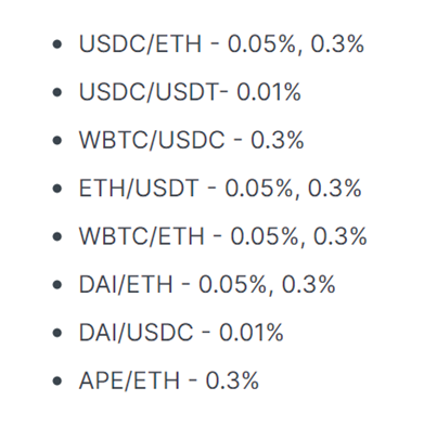 并支持 APE、cAPE、ETH、DAI、WETH、stETH、USDC、USDT 共计 8 种 ERC-20 资产,以及创新地支持由以上 ERC20 组成的 12 组 UNISWAP V3 LP(指定费率)作为抵押品。