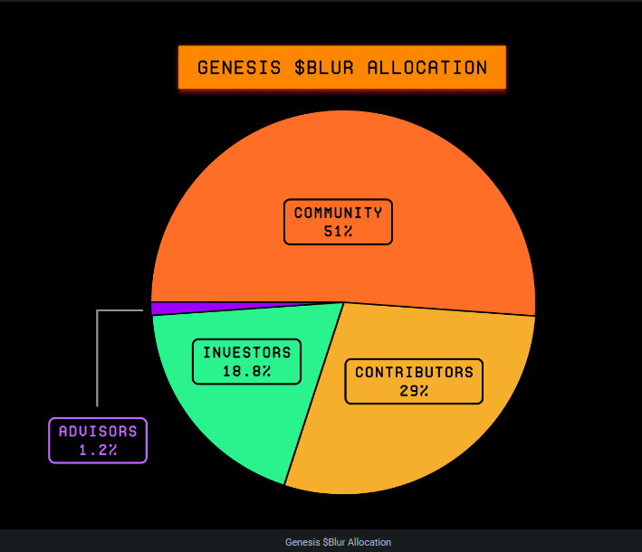 BLUR总供应量30亿枚,51%分配给社区,29%给过去和未来的核心贡献者(为期4年分配,在前4个月有转移额度解锁),19%给投资者(为期4年分配,在前4个月有转移额度解锁),1%给顾问(在4-5年分配,并有4-16个月的线性解锁)。