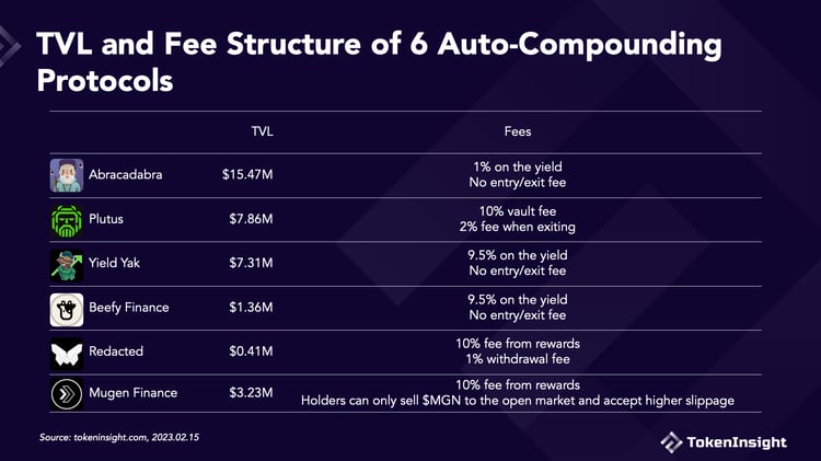 Beefy FinanceBeefy Finance的 TVL 为 136 万美元。它的金库每天至少滚利一次,并在每次有存入时滚利。因此,利滚利操作每天发生会 10-20 次。它同样收取收益的 9.5% 作为管理费,且没有进入/退出费用,这与 Yield Yak 完全相同。