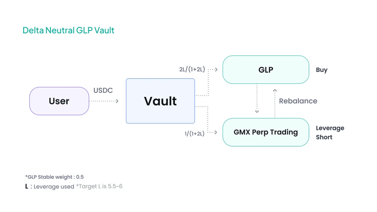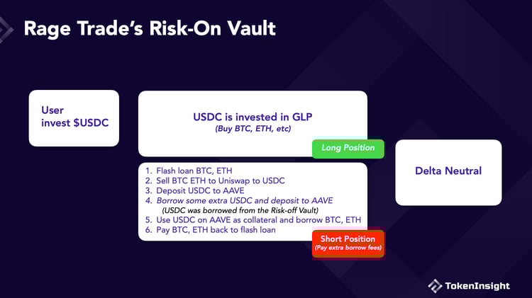 Rage TradeRage Trade的 Delta Neutral 金库是最受欢迎的,它被称为 Risk On Vault。Rage Trade 的 Risk On Vault 将用户存入 $USDC 投资进 GLP 池,同时通过闪电贷建立 $ETH 和 $BTC 的空头头寸。我们之前的文章更详细地解释了 Rage Trade 的机制。最终的结果是,当你持有 GLP 时,Rage Trade 自动对冲了你的多头敞口。