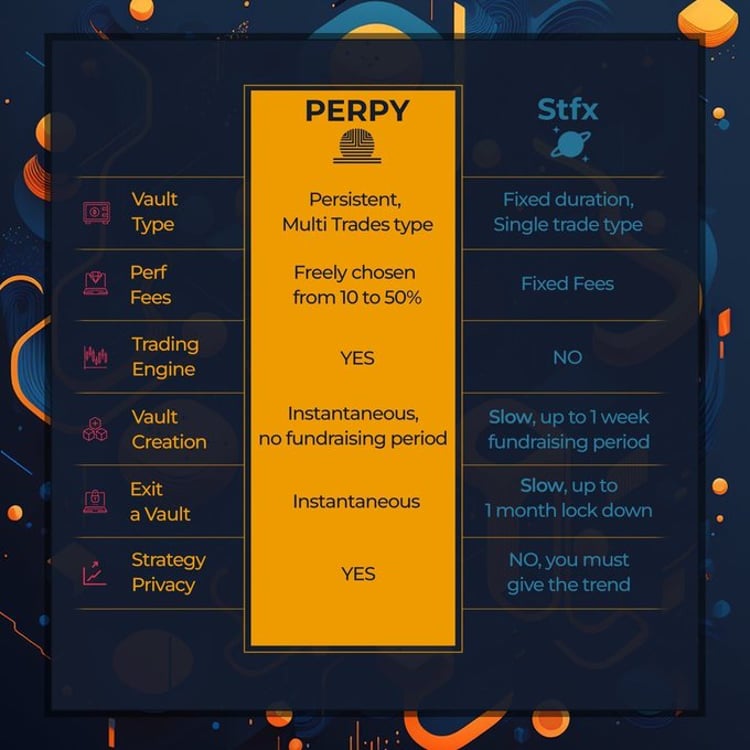 Perpy FinancePerpy Finance在概念上与 STFX 相似,但在设置上有所不同。根据 Perpy 的说法,主要区别在于 Perpy Vault 是连续的,收取可变费用,没有筹款期,并保护隐私。