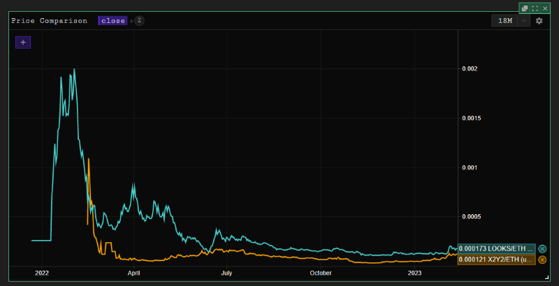 以 NFT 市场 LoGate.iosRare 和 X2Y2 为例,它们都在去年年初推出了 LOOKS 和 X2Y2 代币激励措施。正如你在下面的价格比较图中所看到的,这两种代币在最初推出的时候都很兴奋,此后价格都有很大下降。随着时间的推移,这两种代币都未能从 OpenSea 手中夺取大量的市场份额。当然,他们的故事仍然在讲述,但显然现在他们已经不像以前那样令人兴奋或诱人了。