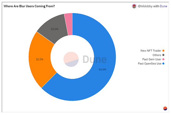 也就是说,Blur 的早期用户中有 65%来自 OpenSea 和 Gem 因此,如果 Blur 能够稳固其护城河,那么这些用户可能会永远转向。
