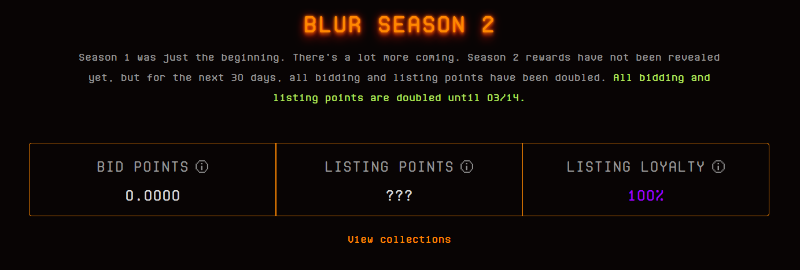 自从空投后,他们推出了 "第二季" $BLUR 奖励,在接下来的一个月里,市场上的所有 Bid 和上市积分都将翻倍。季节性的方法在这里有很大的意义。