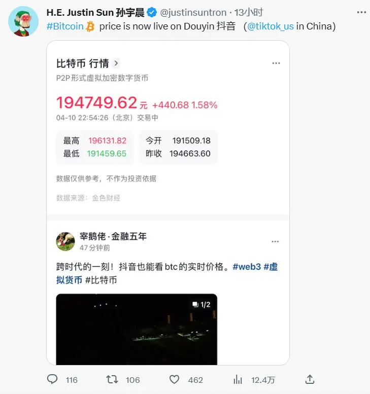 昨日晚间,不久前被美国证券交易委员会(SEC)指控涉嫌非法销售证券、欺诈和操控市场的孙宇晨在其个人社交媒体账号上称,抖音开始显示比特币价格,随后这一消息在币圈刷屏。