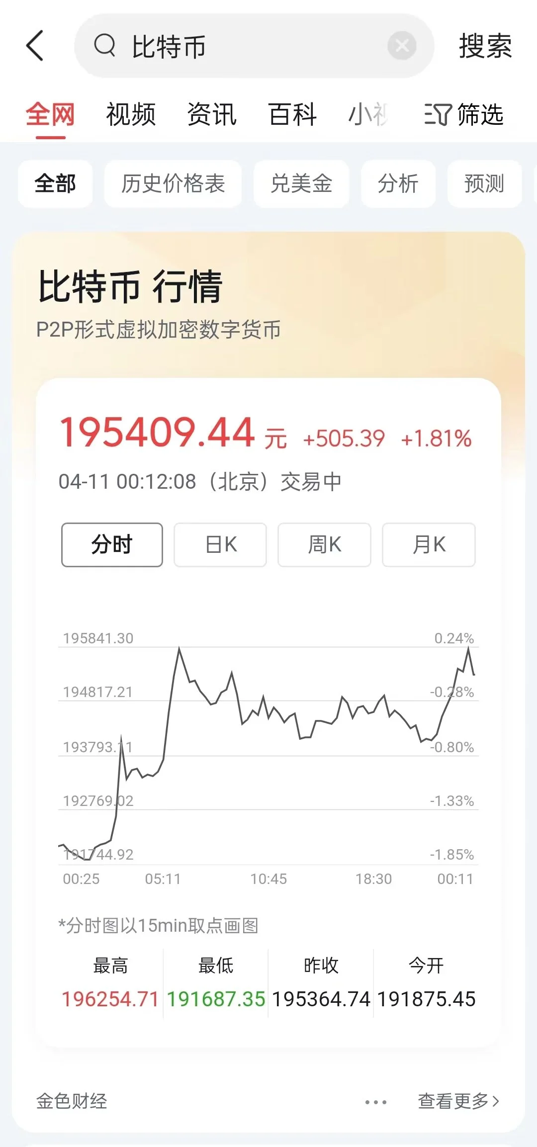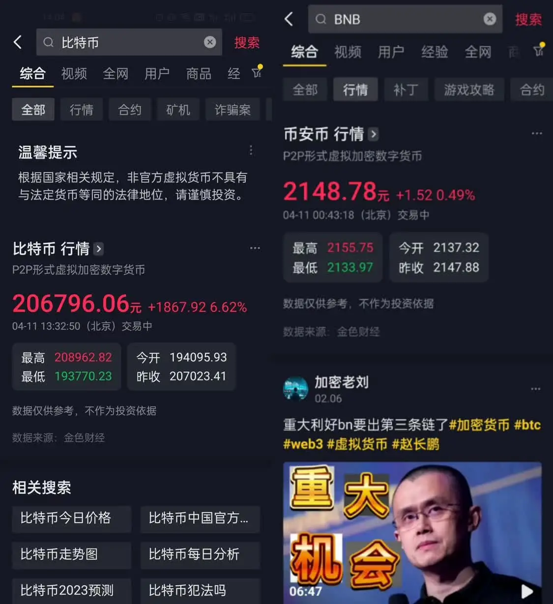 抖音APP内搜索后可显示比特币、以太坊、莱特币、瑞波币等个别主流虚拟货币的行情,甚至还有全球最大虚拟货币交易所Binance推出的平台币(BNB),并且为人民币计价。抖音显示数据来源为金色财经,其为一区块链垂直资讯平台。同一时间观察者网在今日头条APP搜索发现,平台内也可实现比特币价格的查询。